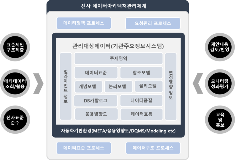 메타데이터 관리체계는 SW 개발단계에서 산출된 메타데이터 정보와 SW 운영 환경의 메타데이터를 수집하고 해석 및 조합하여 단위 논리 데이터모델을 재구성하는 알고리즘으로 구현된다. 메타데이터 관리체계는 논리 데이터모델 기반의 메타데이터저장소(MDR – Metadata Repository)를 구축하고 MDR의 논리 데이터모델과 전사 데이터베이스의 데이터아키텍처 간에 상호 정합성(mutual consistency)을 유지할 수 있도록 한다.