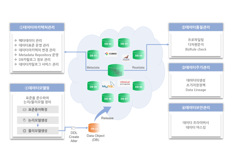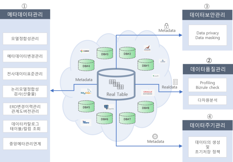 메타데이터 관리는 데이터모델 간의 정합성을 유지하며 데이터아키텍처의 변경을 관리하며 전사 데이터 표준관리를 통하여 원하는 데이터를 빠르고 쉽게 식별할 수 있는 데이터 거버넌스 환경을 지원한다. 데이터품질 관리는 리얼 데이터의 프로파일링 및 데이터 정제 작업을 통해 데이터의 정확성을 유지한다. 데이터보안 관리는 필요한 데이터의 보호 수준을 정의하고 개인정보를 위한 데이터 마스킹을 운영한다, 데이터주기 관리는 데이터의 생성 및 초기 저장부터 데이터의 폐기까지 생명주기를 관리한다.